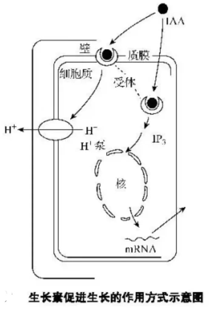 植物细胞具有全能性,但在一般情况下,绝大部分基因是处于抑制状态的,生长素的作用就是解除这种抑制,使某些处于“休眠”状态的基因活化,从而转录并翻译出新的蛋白质。当IAA与质膜上的激素受体蛋白(可能就是质膜上的质子泵)结合后,激活细胞内的第二信使,并将信号转导到细胞核内,使处于抑制状态的基因解阻遇,基因开始转录和翻译,合成新的mRNA和蛋白 质,为细胞质和细胞壁的合成提供原料,并由此产生一系列的生理生化反应。