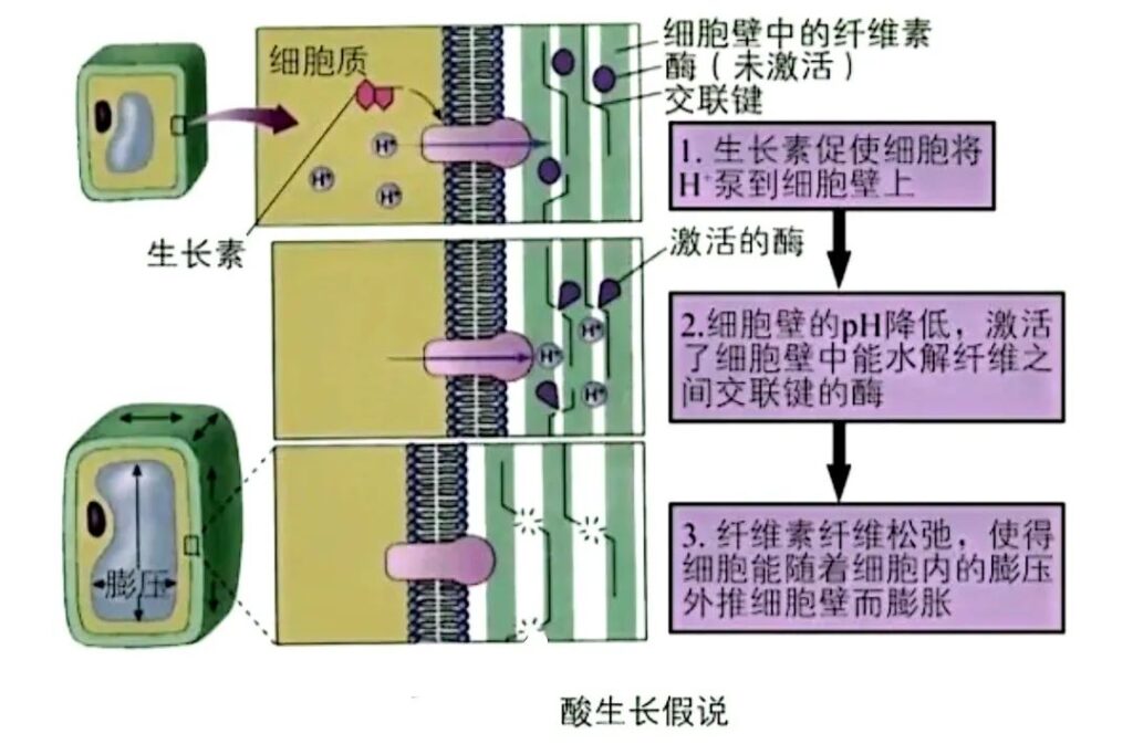 生长素的酸—生长素假说认为,生长素与内质网上的生长素受体蛋白结合,进一步通过信号转导,促进质子泵活化,把质子(H+)补到细胞壁。质子排出有两种假说:一是活化假说,生长素活化质膜上原已存在的H+-ATP酶,反应迅速;二是合成假说,生长素促使第二信使合成新的H-ATP酶,反应较慢。这些酶就分泌H+到细胞壁去。当细胞壁酸化(在酸性pH)后,就活化一组蛋白叫作扩展素。它作用于细胞壁中的纤维和半纤维素之间的界面,多糖分子之间结构组织点破裂,联系松驰,膨压就推动细胞伸长,细胞壁可塑性增加。由于生长素和酸性溶液都可同样促进细胞伸长,生长素促使H+分泌速度和细胞伸长速率一致,据此,把生长素诱导细胞壁酸化并使其可塑性增大而导致细胞伸长的理论,称为酸一生长假说。