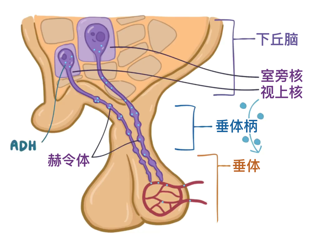 大脑有两个相互连接的结构:下丘脑和垂体。这两个结构通过垂体柄相连。下丘脑是大脑的一部分,包含多个核团,即神经元的簇。这些核团中的两个——室旁核(paraventricular nucleus)和视上核(supraoptic nucleus)含有分泌抗利尿激素(ADH)的神经元。当抗利尿激素(ADH)产生时,它沿着这些神经元的轴突传递,这些轴突上有小的膨大部分,称为赫令体(Herring bodies),在这里储存着抗利尿激素。当身体需要更多抗利尿激素(ADH)时,储存的激素被释放,并沿着轴突通过垂体柄继续传递。