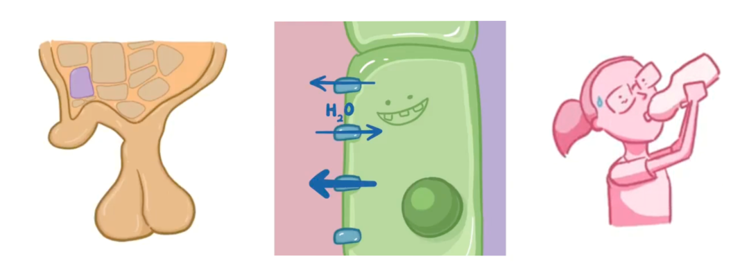 与此同时,两件事情开始同时发生。首先,大脑中有一个叫做前下丘脑的区域,这里有一群叫做视上核(supraoptic nuclei)的神经元,它们含有渗透感受器,能够感知渗透压的微小变化,甚至是1mOsm/L的变化。这些神经元始终在监测通过的血液,并且它们有一个特殊的通道叫做水通道蛋白4(aquaporin 4),它允许水分自由地进出细胞。