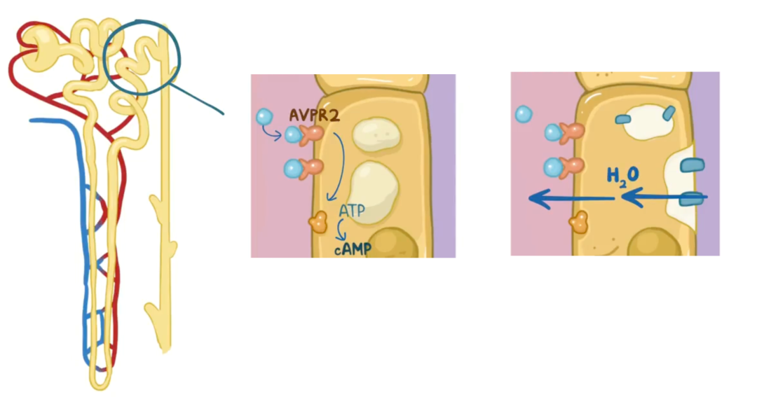 cAMP水平的增加会导致两件事情:首先,它向细胞发出信号,促使其产生更多的水通道蛋白,即水通道蛋白2(aquaporin 2),这些蛋白通常位于主细胞内的囊泡中;其次,它促使装载有水通道蛋白2的囊泡与细胞膜融合,使这些水通道蛋白2嵌入细胞的顶膜表面——即面向肾小管腔的那一侧。