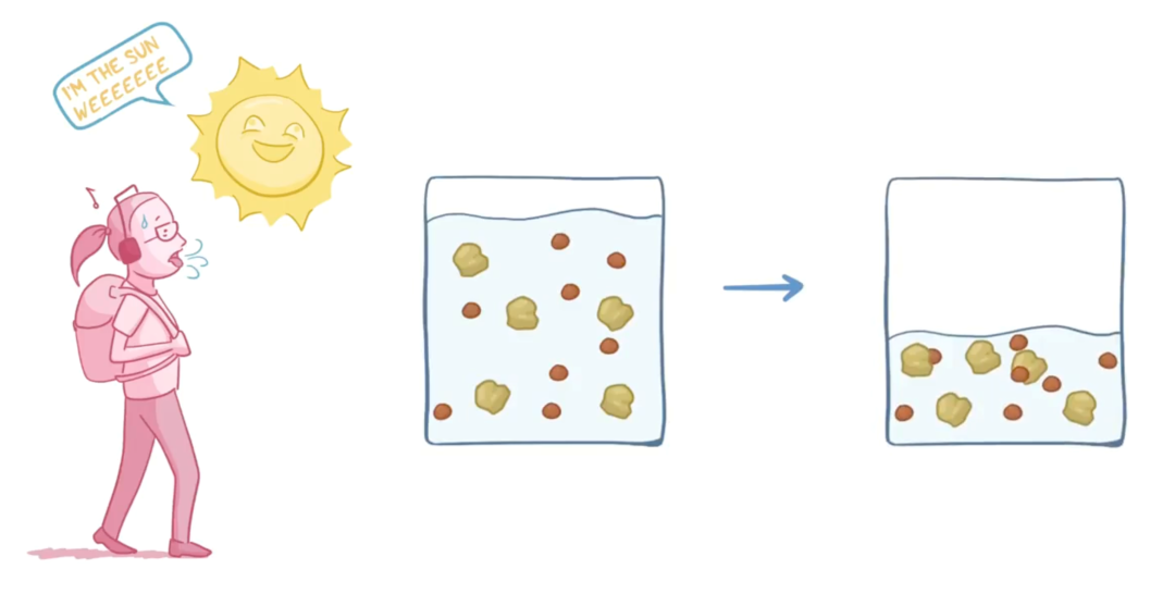 假设今天是一个阳光明媚的日子,而你忘记带水了。首先,当你走动时,你会以出汗以及口鼻呼气的方式流失水分——这些都是不可察觉的水分丧失。如果没有喝水,你很快就会脱水。这会导致你的血浆渗透压增加,因为血液中的液体水平下降,但溶质颗粒的总数大致保持不变。