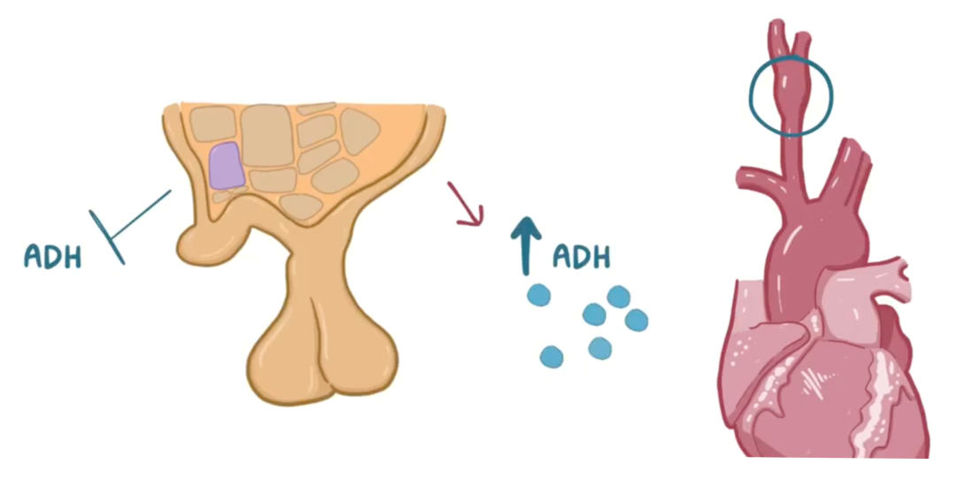 现在,抗利尿激素(ADH)可以通过两种方式增加血压。首先,ADH增加远曲小管和集合管中的水通道蛋白2(aquaporin 2)的数量,这些水通道蛋白将水从尿液中重吸收,并补充血浆容量。其次,ADH作用于动脉中的平滑肌细胞,导致它们收缩,从而增加外周血管阻力和血压。当这种情况发生时,压力感受器会检测到血压的升高,并向下丘脑发送抑制信号,进而停止ADH的分泌。