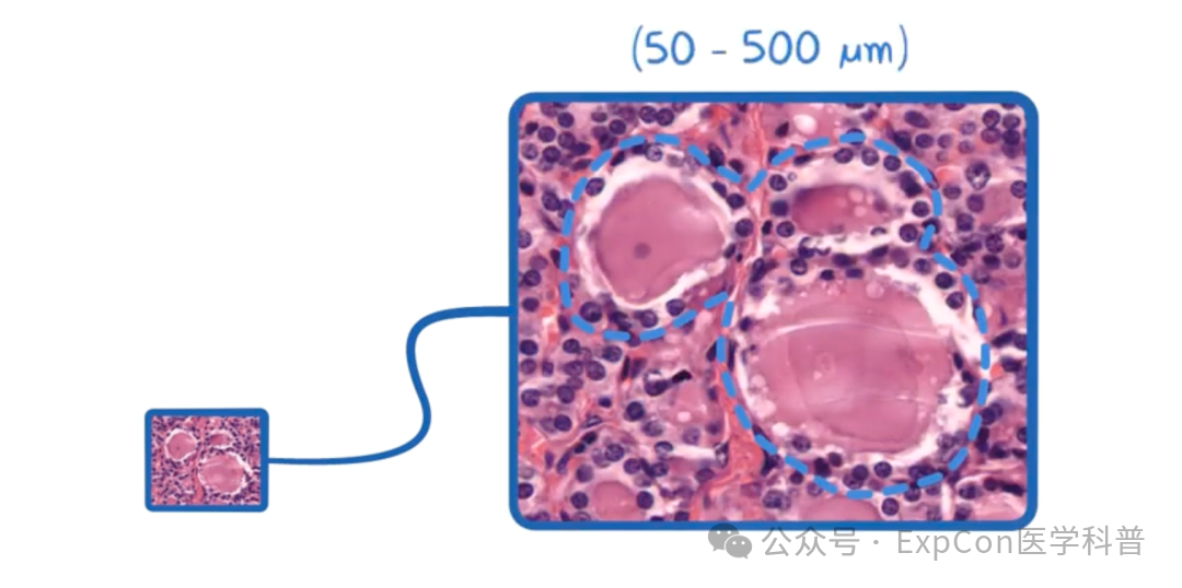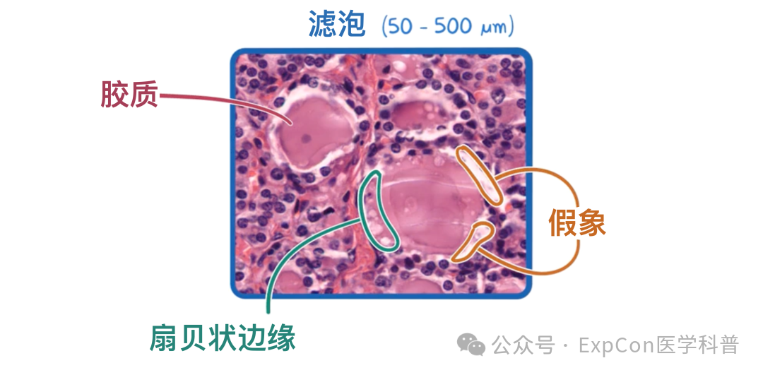 每个滤泡内部充满一种凝胶状物质,称为胶质,在HE染色下呈深粉色。胶质主要由甲状腺球蛋白和与胶质结合的甲状腺激素组成。
