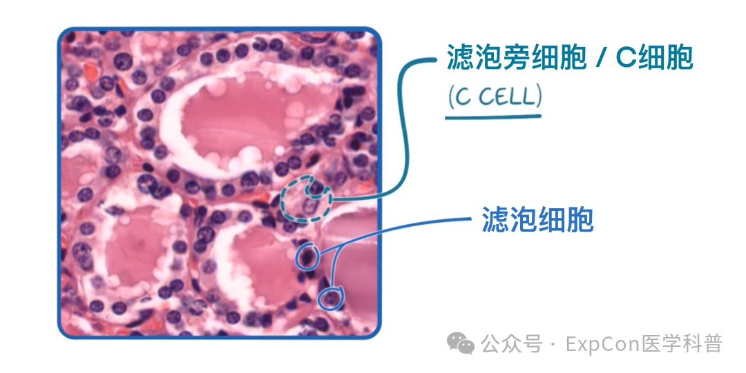 这些浅染的细胞具有颗粒状的胞质,主要分泌降钙素。它们体积比滤泡细胞更大,但数量更少。它们通常位于滤泡内衬的边缘,或者分布在滤泡之间的间质中。