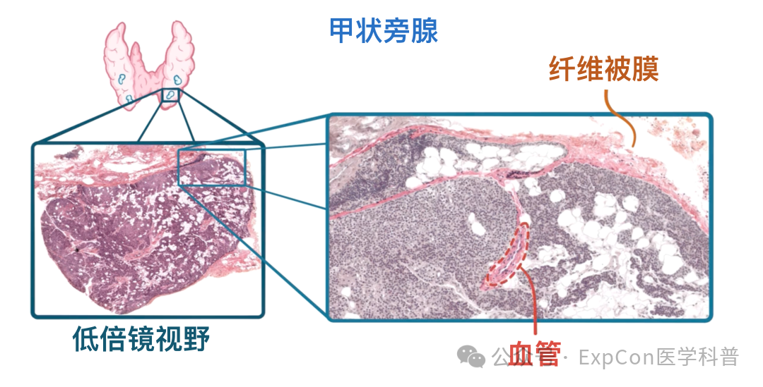 在这张图像中,还可以看到分布在甲状旁腺内的脂肪细胞,它们同样会随着年龄的增长而增加。