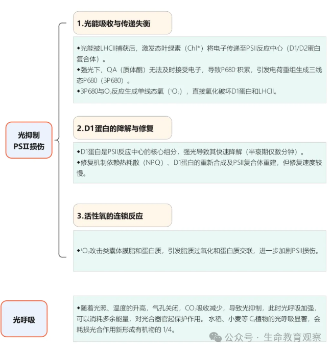此外,午休现象还有非气孔因素。午休现象的非气孔因素主要包括光抑制和光呼吸增强:①强光引发光抑制,导致 PSII(光系统 Ⅱ)损伤,活性氧破坏光合结构,降低光合效率;②C₃植物(如水稻、小麦)光呼吸显著增强,消耗光合作用新形成有机物的 1/4,同时高温会钝化叶绿体酶、阻碍光合产物输出。