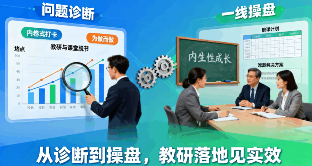 打破教研”为做而做”的困局,把”内卷式打卡”转为”内生性成长”,从来不是靠空想,而是靠一步步扎实的落地实践。这需要我们每位校长既当好”问题诊断员”——精准揪出教研与课堂脱节的堵点,更当好”一线操盘手”带着教师一起啃备课、磨课堂、解难题。