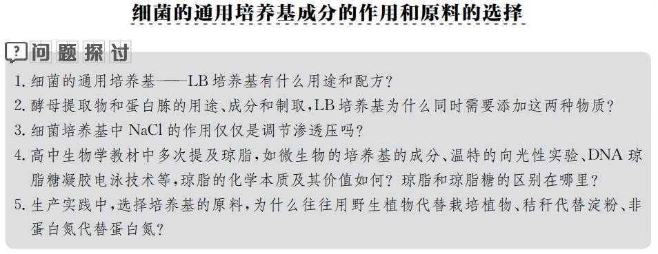 关于细菌的培养基各成分的作用,我在编写选择性必修《疑难解惑》第241页中已经详细叙述,但还缺少生长因子内容的具体介绍。
