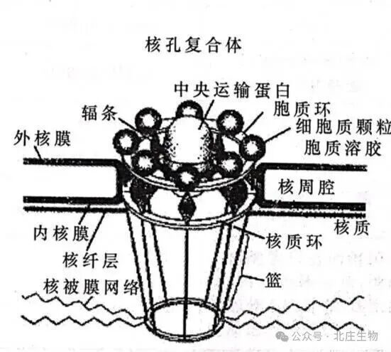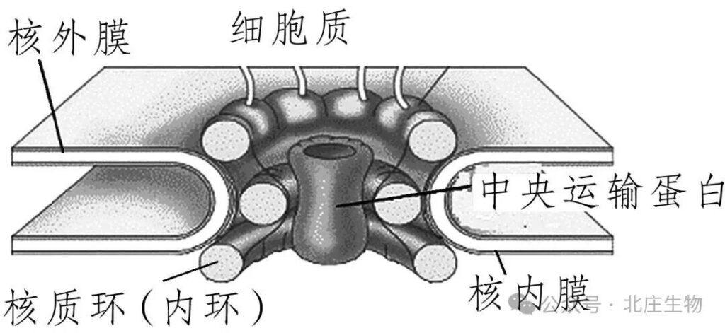 核孔复合体是一亲水通道,它允许离子和水溶性小分子穿梭于核质之间,进行自由扩散。分子质量越大的分子通过核孔复合体的速率就越慢,分子质量大于60kDa的球蛋白几乎不能进入核内。