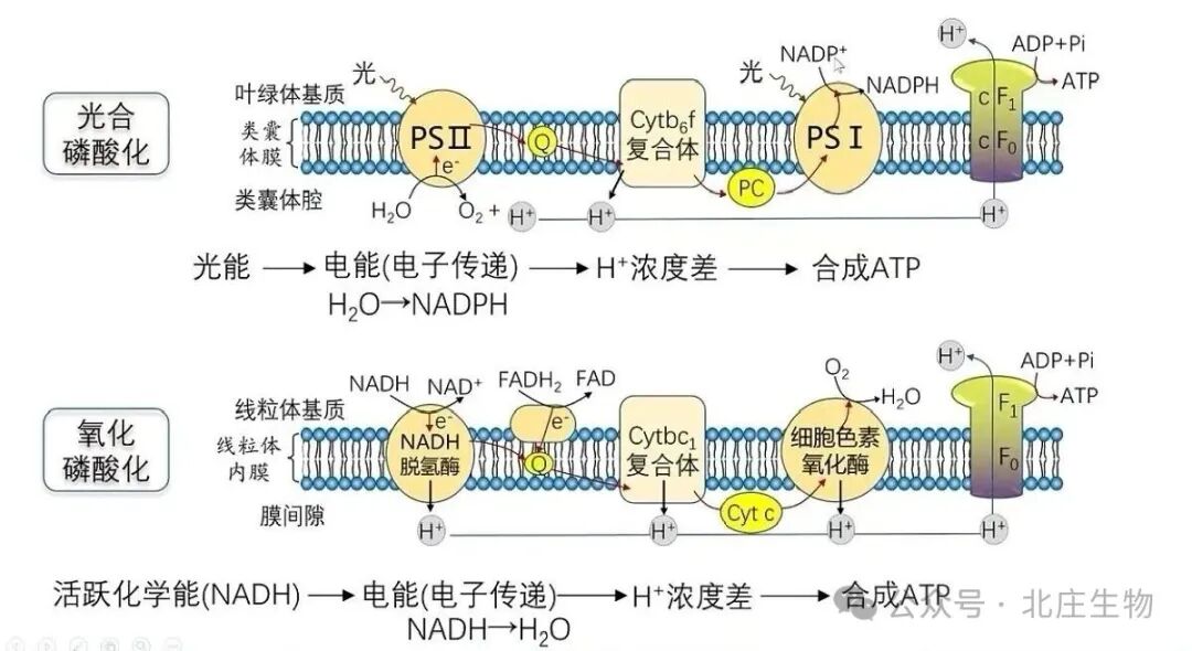 氧化磷酸化(线粒体): 质子泵为复合体I、III、IV,靠电子传递释放能量将质子从基质泵至膜间隙 。