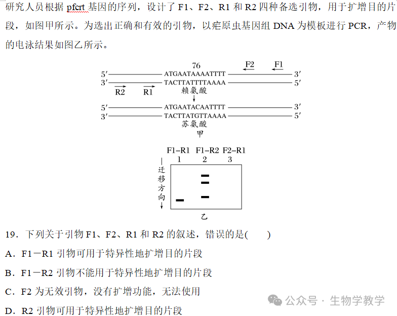 该题考查 “特异性原则” 的核心 —— 引物 3′ 端必须与模板完全匹配,才能避免非特异性扩增。选项 A 中 F1-R1 引物仅扩增出一条带,说明其 3′ 端与目的基因序列完全匹配,无额外结合位点;选项 B 的多带结果则是因为引物 3′ 端与非目标序列结合,违背了特异性原则。