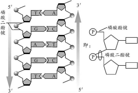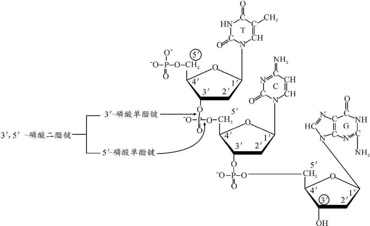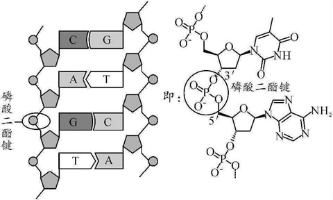 可以看出,磷酸二酯键是两个核苷酸分子核苷酸残基的两个羟基分别与同一个磷酸基团形成的共价连接键。和肽键一样,肽键不再指一CO一NH一这个结构,而仅指一CO一NH一中间的化学键,磷酸二酯键也不再指包括磷酸在内的整个结构。如果将结构表示完整,那么磷酸二酯键是指C与O之间形成的共价键(图3)还是O和P之间的共价键(图4)呢?