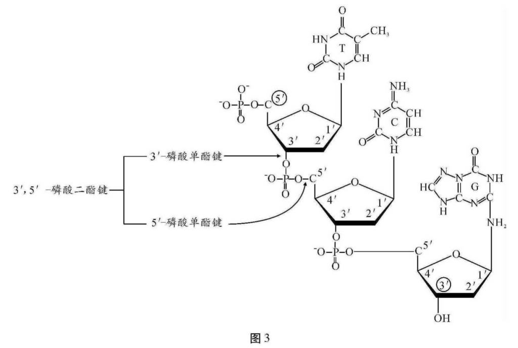 从生化原理来看,不管是3 ‘一磷酸单酯键,还是 5 ‘一磷酸单酯键,它们的形成都是核糖碳上的3 ‘ OH或者5 ‘一OH中带孤对电子的0对NTT)或者 dNTP中的一个P作亲核进攻形成的共价键,所以与 O(来自核糖或脱氧核糖的羟基)和P(来自核苷酸的磷酸基团)有关。在DNA复制过程中,新链是通过在 3 ‘ -OH端添加dNTP并形成磷酸二酯键来延伸的。因此,图4更准确。