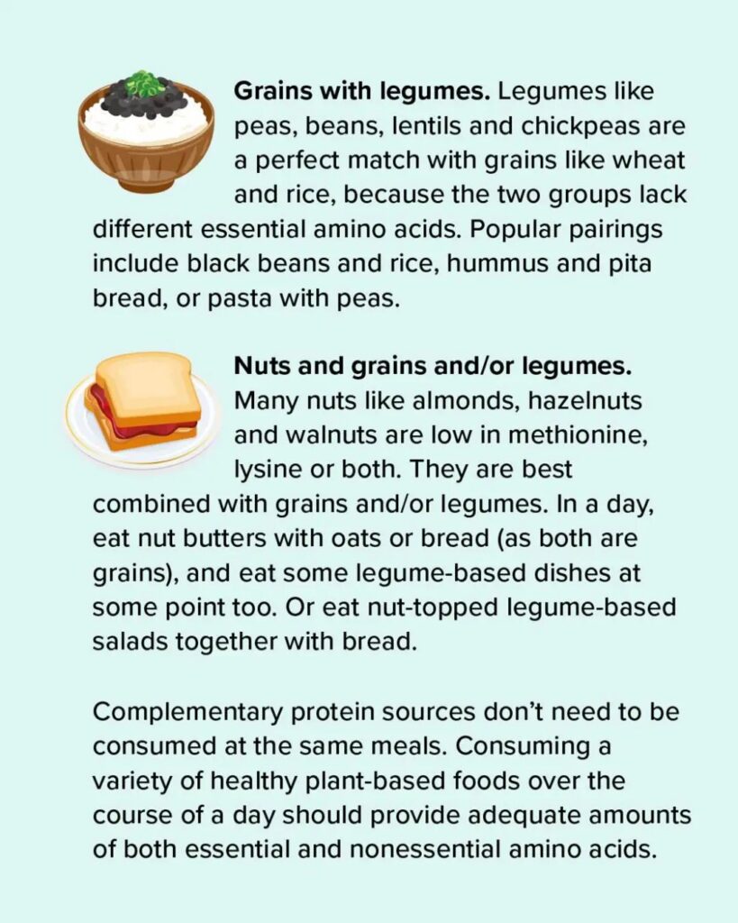 【图注:Grains with legumes 谷物配豆类,Legumes like peas,beans,lentils and chickpeas are a perfect match with grains like wheat and rice,because the two groups lack different essential amino acids. 像豌豆、豆类、小扁豆和鹰嘴豆这样的豆类与小麦、大米这样的谷物是绝配,因为这两类食物缺乏不同的必需氨基酸。Popular pairings include black beans and rice,hummus and pita bread,or pasta with peas.常见的搭配包括黑豆配米饭、鹰嘴豆泥配皮塔饼,或是意面配豌豆。 Nuts and grains and/or legumes 坚果配谷物和/或豆类,Many nuts like almonds,hazelnuts and walnuts are low in methionine,lysine or both 许多坚果如杏仁、榛子和核桃的甲硫氨酸、赖氨酸含量较低,或两者都低。They are best combined with grains and/or legumes.它们最适合与谷物和/或豆类搭配食用。In a day,eat nut butters with oats or bread (as both are grains),and eat some legume-based dishes at some point too.一天中,可以把坚果酱和燕麦或面包(两者都是谷物)一起吃,同时也要吃一些豆类菜肴。Or eat nut-topped legume-based salads together with bread. 或者吃坚果点缀的豆类沙拉配面包。 Complementary protein sources don’t need to be consumed at the same meals.互补性蛋白质来源不需要在同一餐食用。Consuming a variety of healthy plant-based foods over the course of a day should provide adequate amounts of both essential and nonessential amino acids.一天中食用多种健康的植物性食物,就能摄入足够的必需氨基酸和非必需氨基酸。】SOURCE: REPORTING BY K. ZIMMER. CREDIT: KNOWABLE MAGAZINE图片来源:K. Zimmer 报道,Knowable Magazine 提供