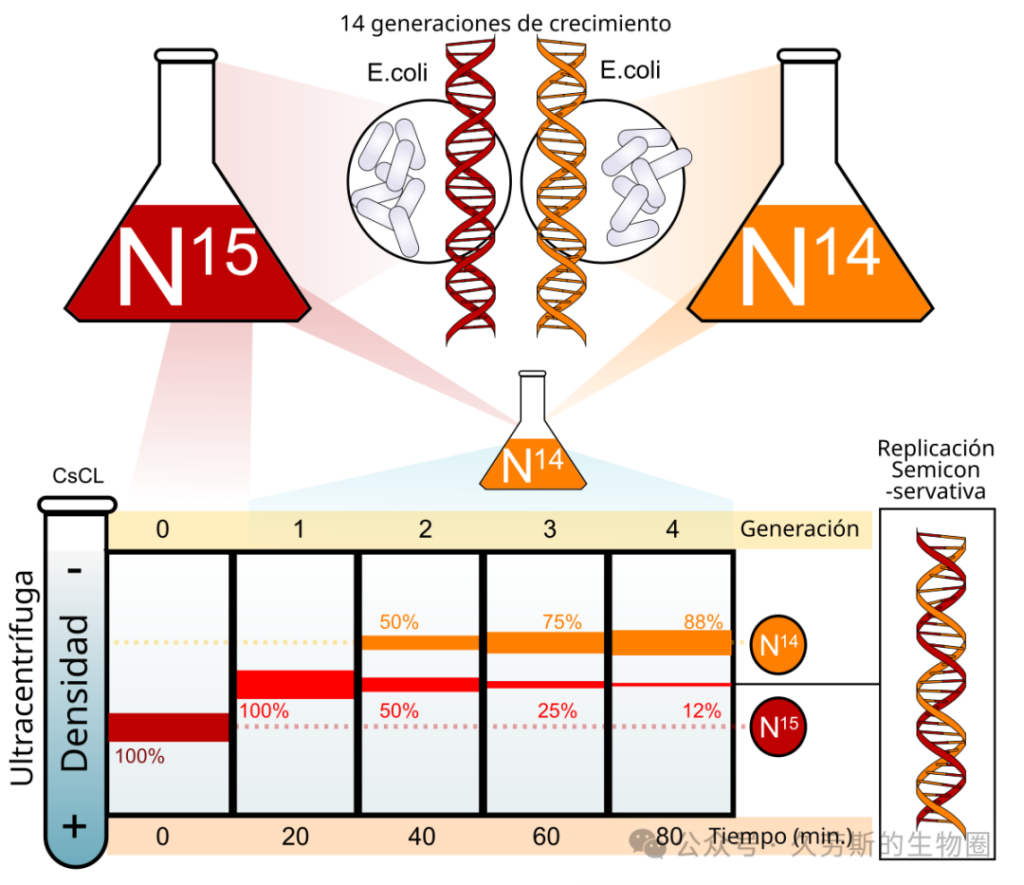 - 步骤一:制备“重”DNA。将大肠杆菌在¹⁵N培养基中连续培养约14代。理论上,经过这么多代生长,几乎所有氮原子都被¹⁵N替换,DNA达到均匀的“重”状态。