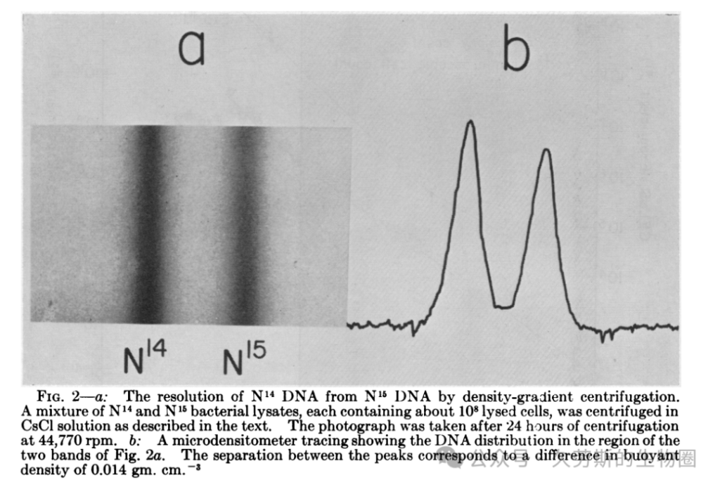 首先,实验必须证明其所依托的技术——氯化铯密度梯度离心——足以分辨由¹⁵N(重氮)和¹⁴N(轻氮)构成的DNA之间微小的密度差异。论文中的一张图示(通常被教科书引用为关键证据之一)展示了将分别培养的“重”DNA(¹⁵N)和“轻”DNA(¹⁴N)混合后离心的结果。紫外吸收照片上,两条清晰分离的条带出现在不同的密度位置,直观地证实了该方法拥有将两者区分开来的分辨率。这是整个实验逻辑得以成立的技术基石。