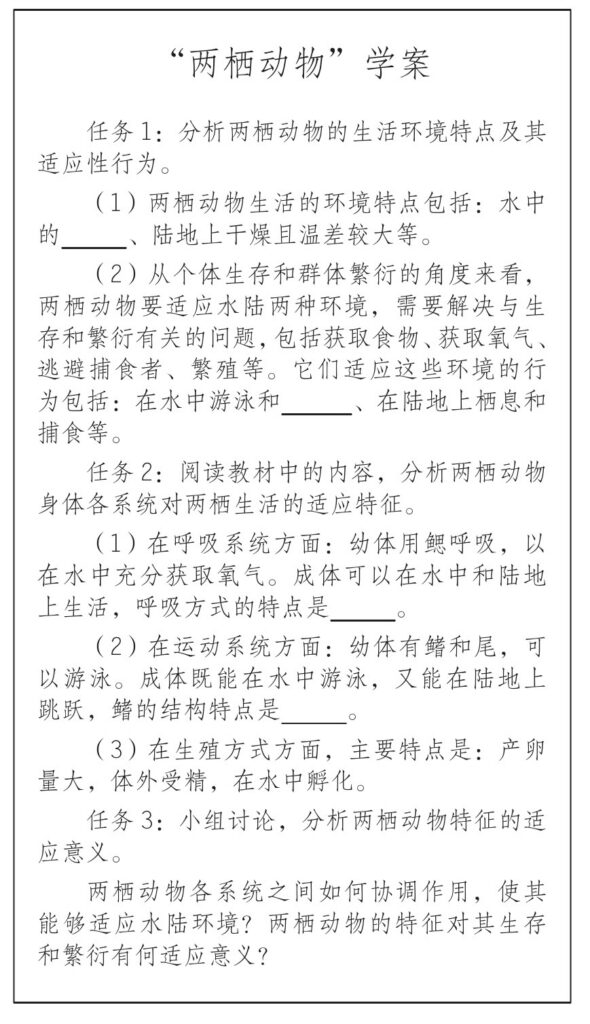 在这一学案设计中,教师设置了三项核心学习任务,旨在帮助学生全面理解两栖动物如何通过结构与行为适应水陆两种环境的挑战。首先,学生需要分析水陆两种环境的特点以及两栖动物的适应性行为;随后,进一步探讨动物机体在不同环境中完成各种生存行为所需要的结构特征;最后,引导学生从适应的意义出发,理解这些适应性特征背后的进化原理。