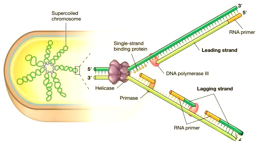 引发体的形成:在解开的单链上,引发酶(DnaG蛋白)与解旋酶及其他辅助蛋白结合,形成引发体。引发酶能够催化合成短链的RNA引物,为后续的DNA合成提供起点。