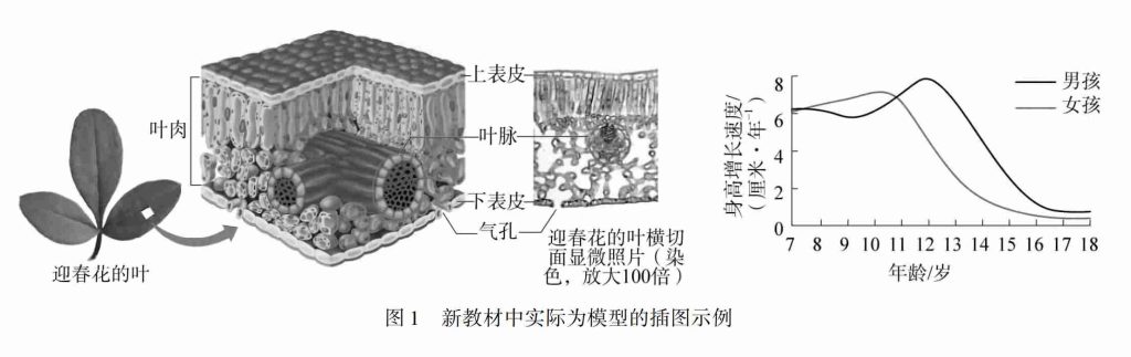 一是部分插图属于模型,特别是示意图和模式图。例如,图 1( 左) 为“叶片的结构示意图及横切面显微照片”,中间的“示意图”呈现了叶片的主要结构,用不同的颜色突出了上表皮、下表皮、叶脉和气孔。这幅示意图反映了抽象的叶片结构,突出了该结构的主要特征,属于模型。