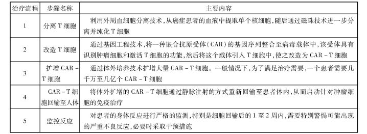 CAR-T细胞疗法的基本原理是从癌症患者血液中分离出免疫T细胞,利用基因工程技术为T细胞引入能够识别肿瘤特异性抗原的单链可变区片段(scFv)和T细胞激活信号分子,构建嵌合抗原受体。通过将这一嵌合基因片段转染到患者自身的T细胞中,使其表达嵌合抗原受体,从而赋予T细胞识别并攻击肿瘤细胞的能力。图1为CAR-T细胞疗法流程图。表1为CAR-T细胞疗法治疗流程。