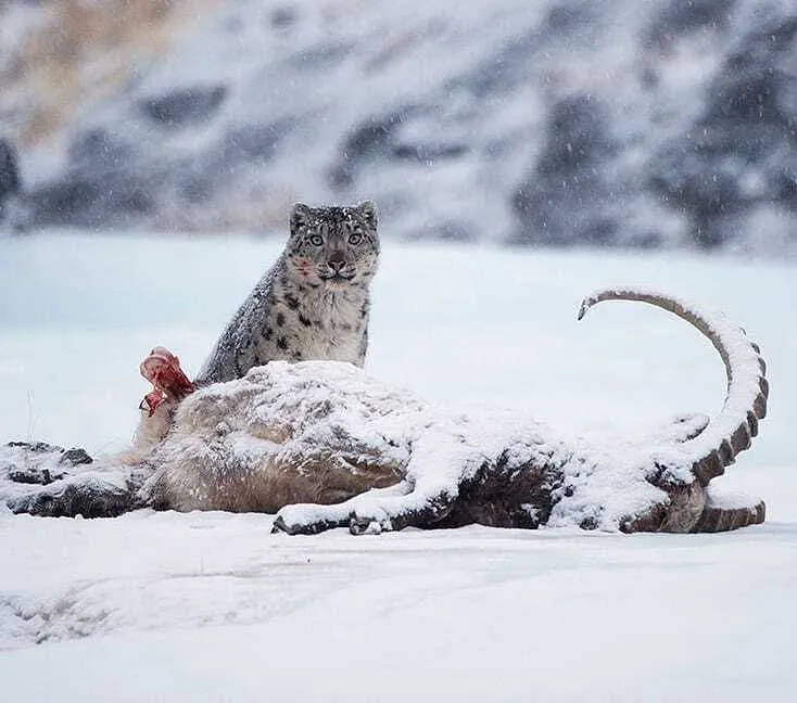 雪豹杀死了一只硕大的北山羊