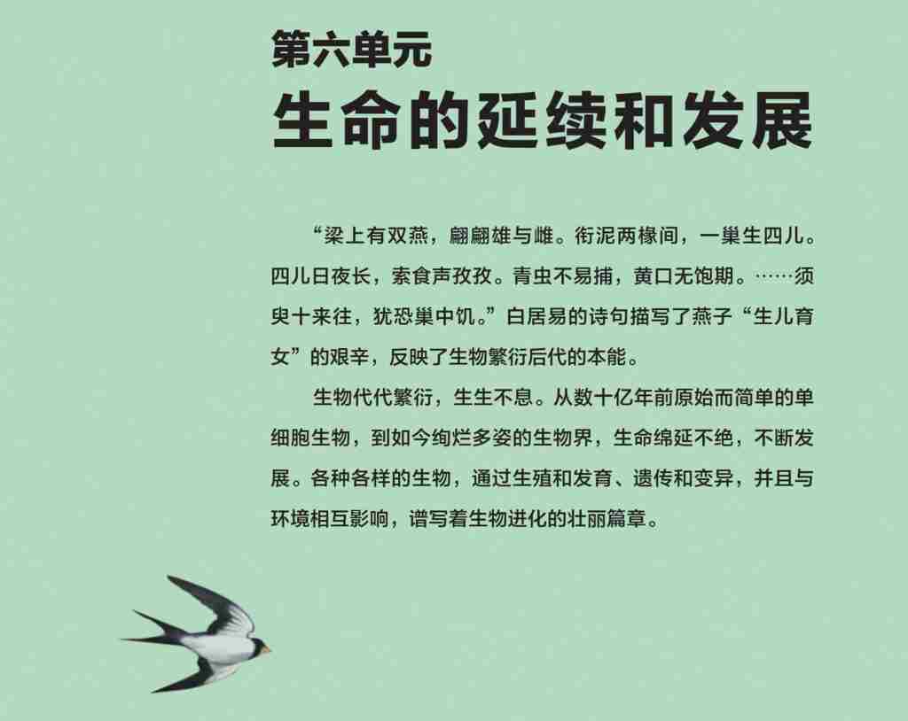 翻开人教版初二下册生物教材第六单元的引言,白居易的几句诗总会不经意间抓住视线:“梁上有双燕,翩翩雄与雌。衔泥两椽间,一巢生四儿。”