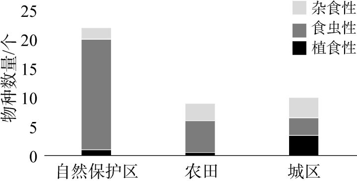 (2024年广东卷第13题)为探究人类活动对鸟类食性及物种多样性的影响,研究者调查了某地的自然保护区、农田和城区3种生境中雀形目鸟类的物种数量(取样的方法和条件一致),结果见图2。下列分析错误的是(C)