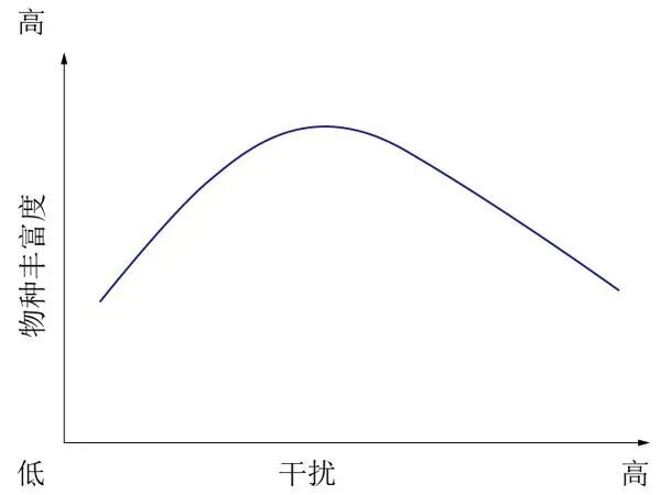 干扰过强:环境破坏严重,多数物种难以生存,只剩下少数耐干扰种类,多样性也低。
