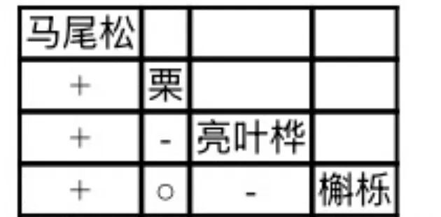 表中亮叶桦与栗、槲栎的种间关联均为“-”(负关联),说明两者无法或很少共存于同一环境,对生存环境与资源利用具有相互排斥作用(本质是生态位高度重叠、种间竞争激烈),因此群落结构不稳定。
