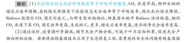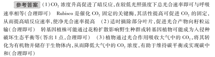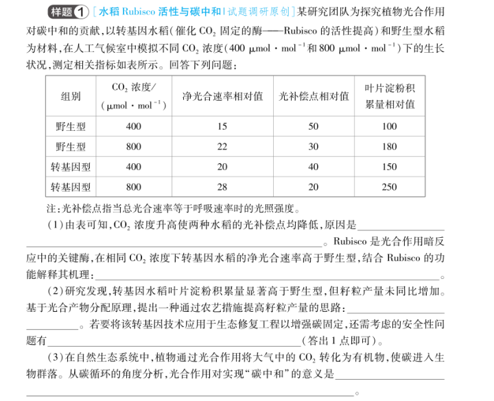 名师点评:课标新增解释光合作用在碳中和方面的重要作用这一内容。本题精准锚定“碳中和”战略背景,依托转基因水稻光合作用改良的前沿科研成果创设真实情境,彰显试题情境的前瞻性与综合性。此外,试题在探讨生物技术应用价值的同时,融入转基因安全性评价的考查,引导考生辩证审视前沿科技,培养严谨求实的科学态度与社会责任担当。预期光合作用与碳中和这一新增考点在2026高考中考查的可能性极大。