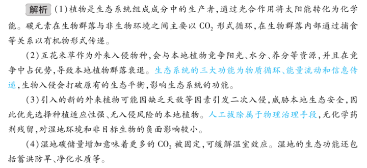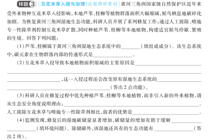 名师点评:课标在“外来生物入侵与防控”模块新增生物安全意识要求,强化生态安全意识。本题以黄河三角洲湿地互花米草入侵与生态修复为真实情境,契合课标导向与高考情境化命题趋势。试题将生物安全意识融入具体问题解决,如优先选用本地植物的生态安全理由、人工拔除与化学防治的优劣对比等,引导教学注重理论联系实际。预测2026高考会继续通过生态修复案例分析、方案设计等,帮助考生形成从生态安全角度思考和解决问题的思维习惯,落实课标对生物安全意识的培育要求。