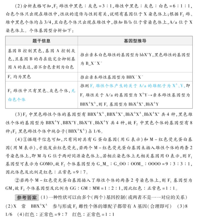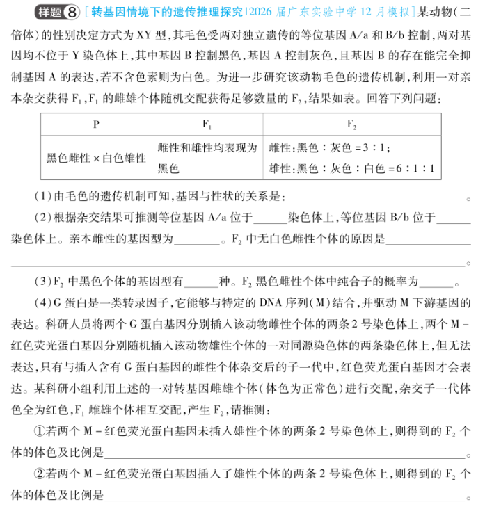 名师点评:本题紧扣课标对科学思维中结构良好试题的考查要求,在较为陌生的遗传情境中,基于亲本及子代表型数据,运用演绎、分析、综合等方法推断基因位置与基因型,并通过计算与推理揭示遗传规律。第(4)小题结合转基因与荧光蛋白表达,进一步考查考生在结构良好条件下进行逻辑推理与结果预测的能力,体现对生命现象变化规律的深入理解和科学思维的全面运用。此类试题虽已考过,但再次考查的概率依然很大。