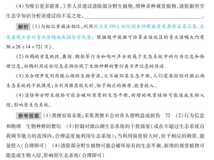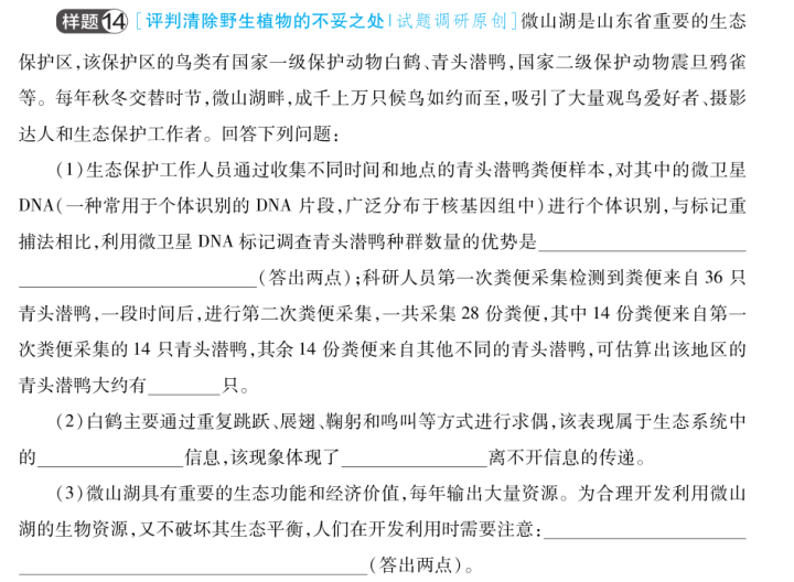 名师点评:课标强调审视或论证与生物学有关的社会性科学议题,基于此,本题以微山湖生态保护为情境,考查科学思维中的比较、分析、综合等方法。通过微卫星DNA与标记重捕法的优势对比,培养考生基于证据的比较分析能力;结合求偶行为与生态系统中的信息传递,考查信息类型及作用的综合推理;在资源开发与植被调整问题中,引导考生分析利弊,凸显对社会性科学议题的理性探讨。