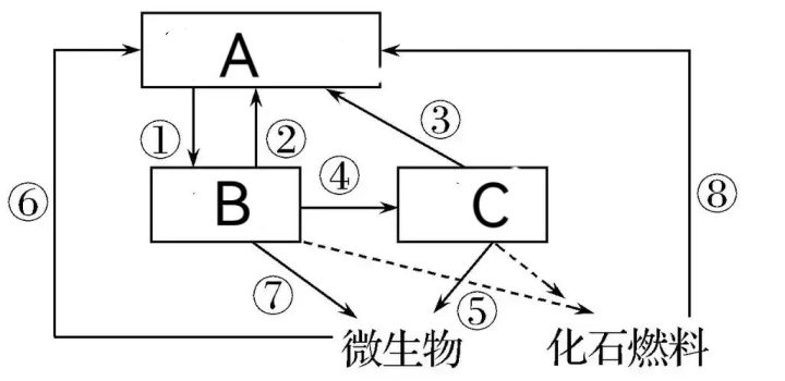 我国力争2030年前实现碳达峰,2060年前实现碳中和,体现了大国担当。下图为生态系统碳循环示意图(A~C代表成分,①~⑧代表过程),回答下列问题: