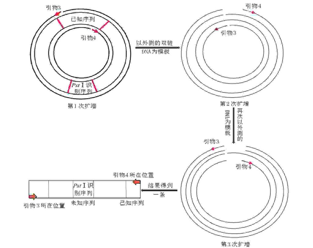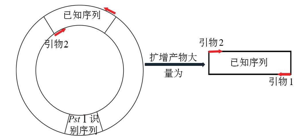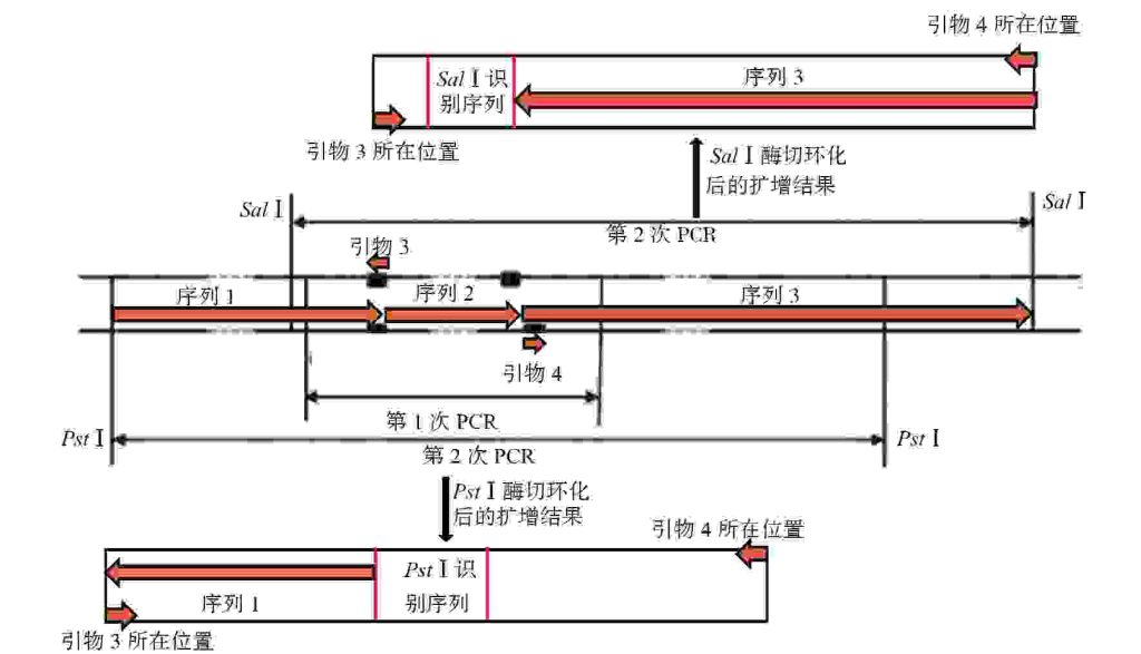 图2 PstⅠ酶切环化后选择序列为P2、P3的引物(用引物3、4代替)的扩增示意图