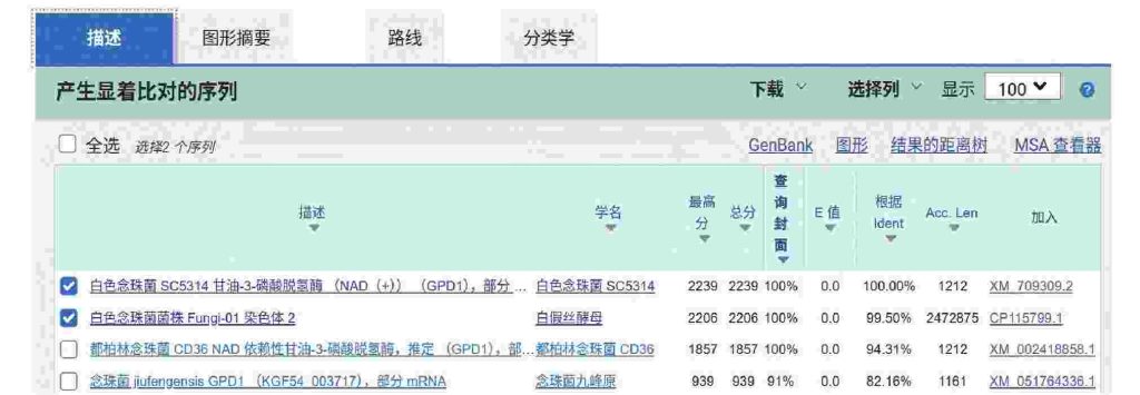 由图4可知,第1次PCR扩增是为得到该基因的中间部分,经测序分析后得到其序列,再根据其序列选择合适位置设计反向引物进行第2次PCR,从而分别扩增出该基因的两侧,再测序得到该基因两侧的序列,进行拼接后即获得完整基因的序列。具体的拼接逻辑如下:如图4所示,GPD基因从左到右分为3个序列,序列1为左侧PstⅠ识别序列到反向引物3的5′端对应的位置;序列2为反向引物3和4对应位置之间的序列;序列3为反向引物4的5′端对应的位置到最右侧的SalⅠ识别序列,序列1、3均不包含限制酶识别序列。引物3的5′端在图示扩增产物的最左侧,而PstⅠ识别序列在扩增产物的内部,由于限制酶识别序列是已知的,故在对测序后的序列分析时可知,由内部PstⅠ识别序列指向扩增产物的最左侧即为GPD基因的序列1,同理分析序列3应该为图示SalⅠ酶切环化后的扩增产物的最右侧,指向内部SalⅠ识别序列。综上所述,第1次PCR后测序得到了序列2,第2次PCR后经测序便能得到序列1和序列3,将其按照顺序拼接便能得到完整的GPD基因。获得完整的GPD基因序列后,利用生物信息学工具,特别是BLAST(basic local alignment search tool),将其与公共数据库中的基因组序列进行比对,确认该序列是否为目标基因,并确认其在染色体上的具体位置。以常见的白假丝酵母菌GPD1基因为例进行BLAST分析演示:假设通过测序后分析获得了一段序列,将其提交至BLAST服务器,选择blastn程序(用于核酸序列比对)和合适的数据库,其他参数设置默认,最后点击BLAST,结果如图5所示。