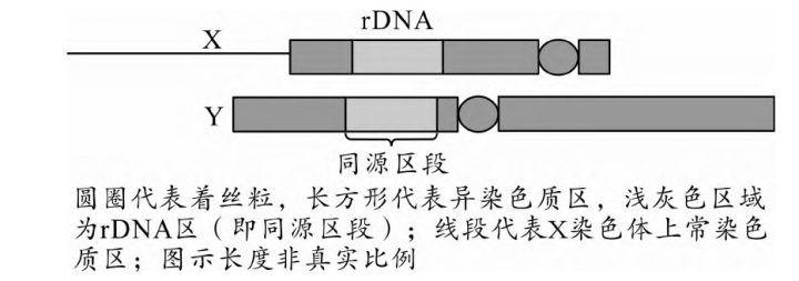 通过对减数第一次分裂前期X、Y染色体配对情况进行研究发现,果蝇X、Y染色体之间同源区段很少,两者唯一的同源区段位于rDNA区,这与上述果蝇Y染色体起源于常染色体的观点一致。X染色体上的rDNA区位于其长臂端异染色质区的中间区域,Y染色体上的rDNA区在其短臂端靠近着丝粒的基部位置(图1)。由于果蝇X、Y染色体同源区段仅分布于rDNA区,而rDNA区是由35SrDNA的数百个重复序列组成的,目前在果蝇中仅发现极少数性状与X、Y染色体同源区段的DNA序列有关,如截毛基因(bobbedgene)决定的截毛性状,其产生实际上与该同源区段的35SrDNA的拷贝数减少有关。基于以上事实,很多研究者认为果蝇的X、Y染色体上不存在同源基因。因此,值得命题者注意的一点是,以黑腹果蝇作为遗传命题的素材时,由于其性染色体上缺乏同源基因,应尽量避免对其X或Y同源区段基因的遗传规律进行考查。