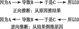 图1中,A是题目中的已知信息,D是题目中的结果,B和C分别代表2个有递进关系的原因,用“导致”和“于是”2个词进行连接,可以从原因到结果进行正向推断,也可以从结果到原因进行逆向推断,这样便可清晰地显示出知识点之间的因果逻辑关系。利用规定的连词,也可以将学生的作答约束在逻辑链条内,让学生把已知条件与结果之间的逻辑关系层层展开,不至于随意乱写,保证其作答的完整性。