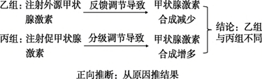 这是一道典型的并列式推理归因类题目,属于正向推断。题目给定“乙组注射外源甲状腺激素(因为A)”和“丙组注射促甲状腺激素(因为C)”,让学生根据所学的“反馈调节”和“分级调节”的知识点,推断出乙组中甲状腺激素合成减少和丙组中甲状腺激素合成增加,因此得到乙组和丙组不相同的结论,具体模型如图2。