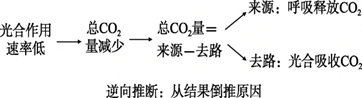 在涉及“光合作用速率”“植物呼吸速率”等类型题目时,通常要从“O2/CO2来源”和“O2/CO2去路”2个方面回答,因为影响速率的因素不是单一的,需要比较来源和去路进行综合考量。光合作用的原料CO2可以来自外界空气,也可以来源于呼吸作用释放的CO2;呼吸作用的O2可以来源于外界的空气,也可以来源于植物自身产生的O2,在分析时要考虑全面,分析“吸收”与“释放”量的关系。针对此题,重点是分析光合作用的主要原料CO2,从来源即呼吸作用释放CO2和去路即光合作用吸收CO2这2个方面分析CO2浓度降低的原因,属于逆向推断,具体模型如图3所示。
