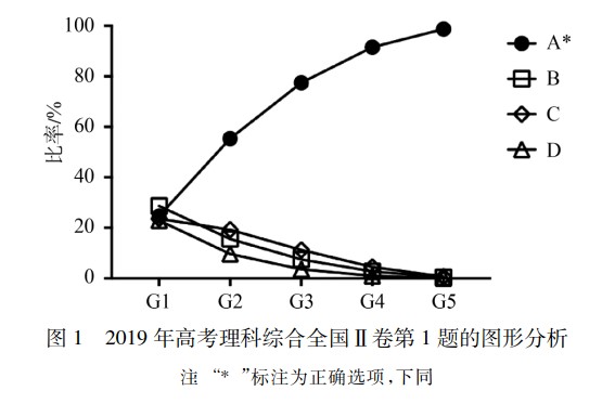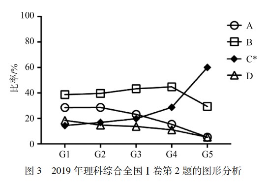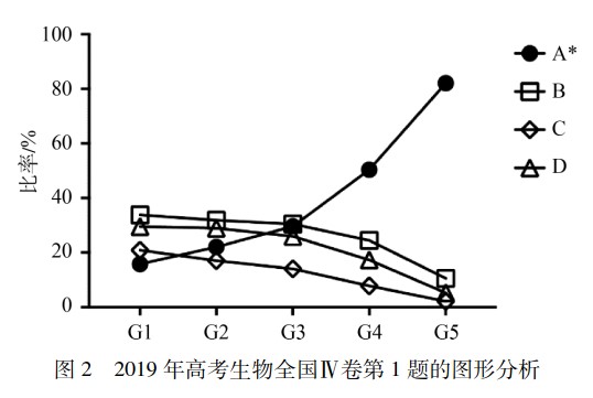 高考生物学试题测试数据的图形分析及教学建议 郭学恒(教育部考试中心) 李东海(国家开放大学)   摘 要 对 2019 年高考生物学部分试题测试数据进行图形分析,直观呈现不同层级水平受试者的表现情况,并显示了解难度和区分度的敏感区间; 结合考查内容与目标,提示教学应注重基础和深化概念理解、加强实验探究和改善科学表达水平、规避套路定势和提升解决问题能力。 关键词 高考试题 测试数据 图形分析 教学建议 高考生物学   高考作为一项大规模考试,其测试数据对命题评价与教学优化有重要的指示作用。有效分析与挖掘测试数据,有助于高考试题区分选拔功能的发挥与教学引导作用的实现。经典测量理论是应用较为普遍且广泛熟知的评价方法,其中难度、区分度是整体评价试题的常用指标,但无法反映试题区分功能的敏感区间。 基于条件概率估计的图形分析法,能够直观呈现试题对于不同层次受试者的难度、区分度,帮助命题者更好地领会试题难度变化、选择题干扰项的迷惑性以及干扰项对不同层级水平受试者迷惑性的变化趋势。本文通过图形分析法对高考生物学试题进行分析,发掘测试目标达成度,并据此提出相应教学改进举措。 1 图形分析,直观呈现数据 本文对 2019 年高考生物学试题实测统计数据进行图形分析。依据受试者总分情况,按五分位数从低到高依次为分 5 组( G1 ~ G5) 。选择题对各组受试者各选项的选择比例进行图形分析,非选择题对各组受试者特定得分的人数比例进行图形分析。 1.1 选择题图形分析 例 1( 2019 年高考理科综合全国Ⅱ卷第 1 题) 在真核细胞的内质网和细胞核中能够合成的物质分别是 A. 脂质、RNA     B. 氨基酸、蛋白质 C. RNA、DNA     D. DNA、蛋白质 例 1 属较易试题,区分度高,试题对不同水平考生的整体区分较好。   从图 1 可知,选择正确选项的比率从 G1 到 G5 依次递增,干扰项的选择比率依次递减; 本题在低分段的区分效果表现更为突出。本题考查的主要是细胞器功能的必备知识,体现基础性考查要求。光面内质网主要合成脂质,附着核糖体的粗面内质网是膜蛋白和分泌蛋白的主要合成场所。细胞核中可进行 DNA 复制和 RNA 转录,但合成蛋白质的核糖体均分布于细胞质,所以细胞核中不能合成蛋白质。 例 2( 2019 年高考生物全国Ⅳ卷第 1 题) 下列与蛋白质、核酸相关的叙述,错误的是 A. 一个核糖体上可以同时合成多条多肽链 B. 一个蛋白质分子可以含有多个金属离子 C. 一个 mRNA 分子上可以结合多个核糖体 D. 一个 DNA 分子可以转录产生多个 RNA 分子 例 2 属中等难度试题,区分度高,整体区分效果较好。由图 2 可知,本题在高分段( G3 ~ G5) 的区分效果更为显著。本题考查生物大分子结构和功能的理解,体现基础性考查要求。干扰项的迷惑性在低分段较强,D 项迷惑性高于其他干扰项。考生对蛋白质的离子组分、转录及翻译过程的图示化理解有所欠缺。对于 A 项,一个核糖体仅有 2 个 tRNA 结合位点,同时只能形成 1 个肽键,因而同时只能合成 1 条多肽链。对于 D 项,一个基因在多个时期进行表达可说明 D 项叙述正确。一般地,表达丰度高的蛋白质其对应基因的转录产物 mRNA 相应较多。  例 3( 2019 年高考理科综合全国Ⅰ卷第 2 题) 用体外实验的方法可合成多肽链。已知苯丙氨酸的密码子是 UUU,若要在体外合成同位素标记的多肽链,所需的材料组合是 ① 同位素标记的 tRNA ② 蛋白质合成所需的酶 ③ 同位素标记的苯丙氨酸 ④ 人工合成的多聚尿嘧啶核苷酸 ⑤ 除去了 DNA 和 mRNA 的细胞裂解液 A. ①②④      B. ②③④ C. ③④⑤      D. ①③⑤ 例 3 试题难度较大,区分度较高。据图 3 可知,正确选项 C 的选择比例从 G1 到 G5 逐渐升高,呈递增状态,在 G4 ~ G5 区段增幅最大,说明对高分段受试者区分效果较强。干扰项 A 项和 D 项选择比例呈下降趋势,符合试题编制的原初目标。干扰项 B 项在G1~G4 区段选择比例呈现较平缓的上升趋势,在 G5 处选择比例最低。可见,干扰项 B 项的迷惑性最强,其各组选择比例均高于 A 和 D。   本题取材于遗传密码破译的经典实验。Marshall Nirenberg 和 Heinrich Matthaei 在14 C 标记的多种氨基酸中,分别加入除去了 DNA 和 mRNA 的细胞裂解液和多聚尿嘧啶核苷酸,发现仅苯丙氨酸能够合成多肽链,由此破译了第一个密码子 UUU。该题主要考查考生对基因指导下蛋白质生物合成的基本条件和主要过程的理解与综合运用,主要体现综合性、应用性考查要求。选择 B 项的考生可能受酶促反应需要缓冲液、底物、酶的定势思维影响,认为有了 mRNA 模板、相应同位素标记的氨基酸及合成所需的酶即可达到实验目的,遗漏蛋白质合成还需核糖体、tRNA、能量等必需材料。干扰项 B 项仅在 G5 中的选择比例不是本组最高项,说明对高分段( 如 G4 组考生) 的迷惑性依然较强,反映出即使学业水平表现较好的考生中亦存在一定程度的思维固化和解题套路化的倾向。A 项中同位素标记的仅有 tRNA,tRNA 在蛋白质合成中仅有转运功能而不构成多肽链产物的任何组分,因而不能产生有同位素标记的产物。由此说明选择 A 项的考生未能理解tRNA 的生物学功能。D 项包含试题所列 5 个材料中有同位素标记的 2 个材料①和③,选择该项的考生可能以此作为依据,却忽视了该组合中缺乏 mRNA 模板。 1.2 非选择题的图形分析 非选择题中的遗传分析