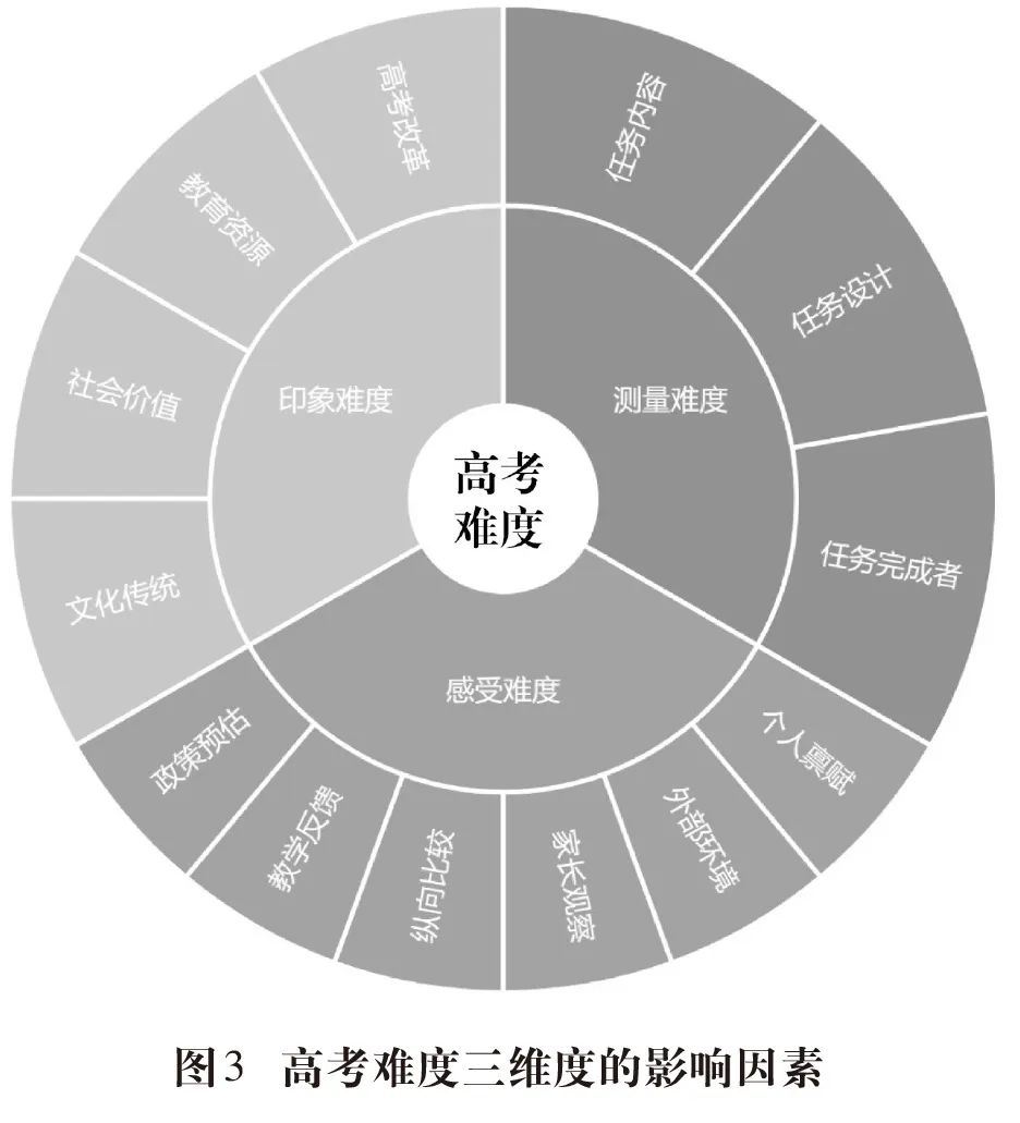 于涵:中国高考难度分析理论构建初探作者:于涵,教育部教育考试院党委副书记、副院长,研究员。  摘 要:传统的高考难度认知停留在统计数据层面。在网络时代,高考难度被赋予情绪意义和社会意义。本研究探讨不同主体视角下高考难度问题的认知差异,构建测量难度、感受难度和印象难度三维度的高考难度分析理论,分析不同维度之间的关系与相互作用机制,并应用高考难度分析理论探究高考难度演进过程及相关问题,提出相应建议。立足中国高考实际构建难度分析理论,有助于更全面地衡量高考难度,深化高考内容改革,实现立德树人、科学选才、引导教学的有机统一,服务教育强国建设。  关键词:高考;难度;测量难度;感受难度;印象难度  高考作为我国教育体系中举足轻重的制度,在选拔人才、影响基础教育和学生成长、决定高等教育资源分配以及提升社会流动性、促进社会公平等方面扮演着关键角色。高考难度是广大师生及社会大众普遍关心的问题,对高考功能的发挥及公众形象产生着重要影响。2019年6月发布的《国务院办公厅关于新时代推进普通高中育人方式改革的指导意见》提出,科学设置试题难度,命题要符合相应学业质量标准,体现不同考试功能。这些都对从制度设计上更全面地衡量高考难度提出了要求。  传统上,人们对于高考难度的讨论常停留在统计数字层面,从一道题目是送分题还是压轴题,到一个班级、一所学校、一个地区考试平均分的高低,其背后都是一个个具有统计学和测量学意义的数字。然而,进入网络时代,高考难度已不再局限于统计意义,还被更广大人群赋予情绪意义和社会意义。考生个体或群体对于考试难度的感受,在虚拟空间中被不特定的主体所感知,进而被放大,形成社会舆论,影响着更广泛的与高考相关或不相关群体的情绪。从这个意义上讲,以往统计学意义上的高考难度指标,已经无法系统解释社会对高考难度的认知,更无法回应社会对高考难度的期望。在此情况下,亟须从多维视角重新界定和丰富高考难度的内涵与外延,探索构建一套内涵自洽、外延融贯的概念体系,从而更有力地阐释高考难度调控的机理,为建立高考难度综合调控机制提供理论支撑和实践指导。一、高考难度的认知差异及其研究的必要性  在新形势下,社会对高考难度的认知更趋多元;在评价高考难度高低时,时常带有较强的个人感受色彩。这要求管理者从制度设计上更全面地衡量高考难度——不仅要深刻认识试题难度的客观性,还要关注学生的主观感受,以及社会对高考难度的普遍认知。  (一)不同群体对高考难度的认知差异  考生、教育教学从业者及各类考试相关群体是对高考难度产生不同认知的三类主体。以往对不同社会群体高考难度认知角度的研究,主要集中在横向比较不同省份的高考难度和纵向对比恢复高考以来不同年度的难度等方面。  广大考生受高考难度的影响最为直接,也最关心难度问题。该群体能接触到高考试题,认为分数反映出对努力学习和备考的回报,希望能够在高考中取得好成绩,在竞争激烈的录取环境中脱颖而出,进入理想的高校。考前,该群体通常会密切关注历年高考的难度及当年高考难度可能发生的变化,行为动机来自掌握与高考难度相匹配的学习方法和应试技巧;考后,该群体主要关注高考难度对自身录取机会的影响。  高中教育教学人员密切关注高考难度的变化和趋势,据此开展教学、辅导学生。该群体一般通过分析高考试题及考生的答题情况来认识高考难度。他们关注高考难度,主要是出于评价教学效果和改进教学的目的,希望能够根据高考难度的要求,帮助学生更好地应对高考的挑战。高校招生人员关注高考难度变化,更多的是从对本校录取分数线的影响以及招选学生结构变化的角度出发。  媒体和社会舆论普遍关注高考难度,并通过相关新闻报道、讨论和评论等表达对高考的关切。该群体关心高考难度,主要是从社会影响、公众舆论和教育公平的角度出发。他们关注高考难度的变化,评估高考难度对社会公平和教育资源分配的影响,对现行教育政策和制度提出改进意见和建议。除此之外,其他社会群体往往不会主动关注高考试题本身,他们对高考难度的认识来自考生或媒体等在网络上传播的关于考生答题感受或高考录取情况的信息积累与印象集合。(二)相关研究对高考难度的认识差异  高考难度一直是社会广泛关注的话题。近些年,随着人民群众对更加公平、更高质量教育的期待,教育研究领域对高考难度的认识角度趋向多元,对高考难度高低的认识也存在较大差异。不同角度和认识差异主要是从高考的不同功能出发,包括但不限于是否有利于高校科学选拔人才、是否有利于高中生健康成长、是否有利于不同区域教育均衡发展等。  有观点认为,高考作为国家选拔人才的重要手段,只有考试内容及难度具有一定挑战性,方能考查出学生解决实际问题的能力。例如,陈志文提出,中高考试题应尽快打破水平化、简单化甚至固化的倾向,加强区分度。但也有观点认为,高考难度大则弊大于利。“高等教育已经步入了大众化阶段,大学生毕业后成了普通劳动者,甚至面临越来越严峻的就业压力。高考试题偏难,对中小学教育的负面影响越来越大,降低高考试卷难度的时机已经成熟,甚至已经是迫在眉睫了。”吕建